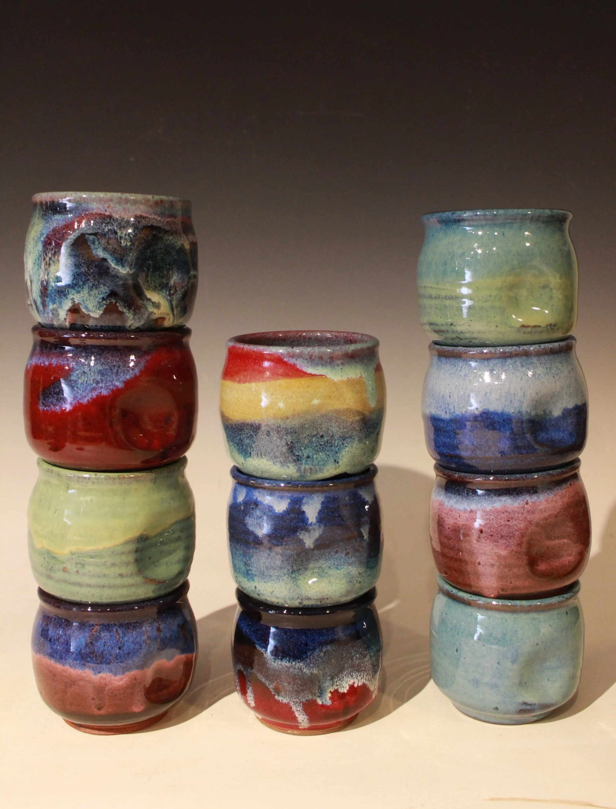 Distinct multi colored glaze patterns make every cup distinct and individual.